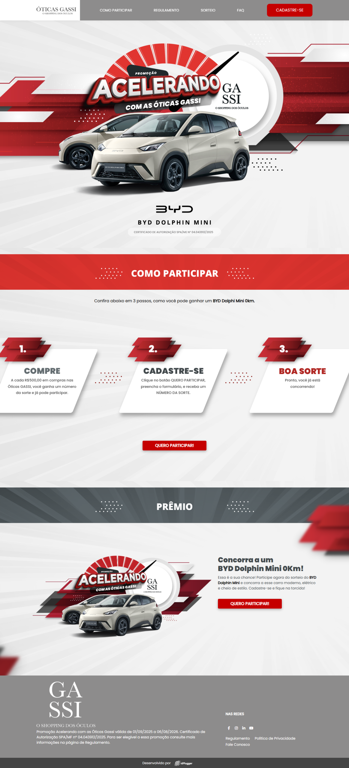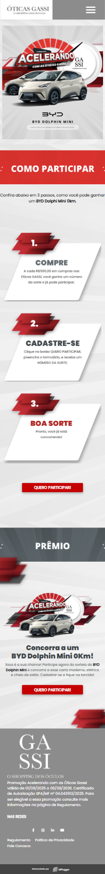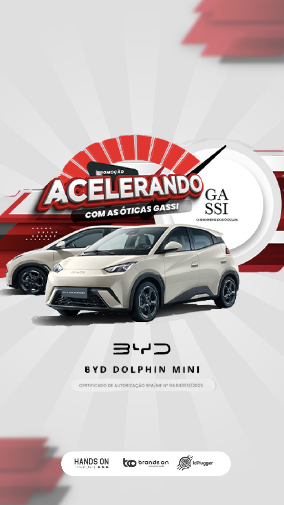 A Óticas Gassi, em parceria com a idPlugger, apresenta a promoção “Acelerando com as Óticas Gassi”, uma campanha que une tecnologia, emoção e fidelidade. A ação convida os clientes a comprarem, cadastrarem-se e concorrerem a um BYD Dolphin Mini 0km, transformando cada compra em uma chance real de acelerar rumo a um grande prêmio.