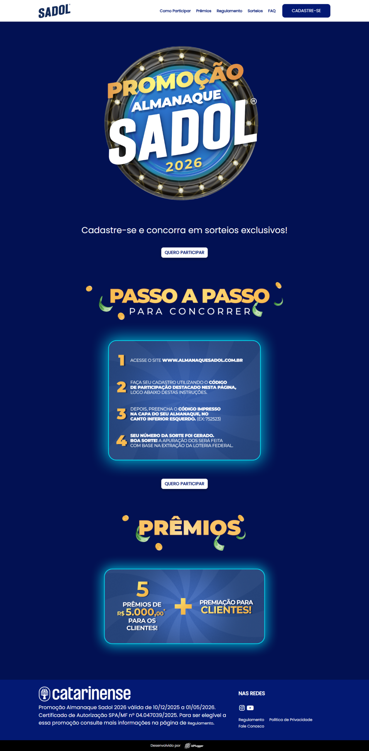 Promoção nacional desenvolvida para impulsionar o engajamento com o Almanaque Sadol 2026, da Catarinense Pharma, utilizando uma mecânica de sorteio baseada em códigos únicos distribuídos na revista. A ação contou com o desenvolvimento completo da plataforma digital pela idPlugger, responsável pela experiência de cadastro, validação de dados e geração dos números da sorte.