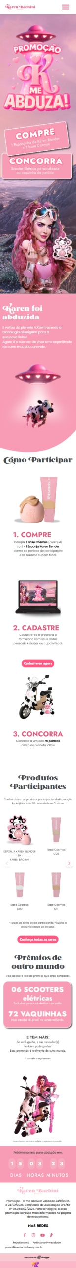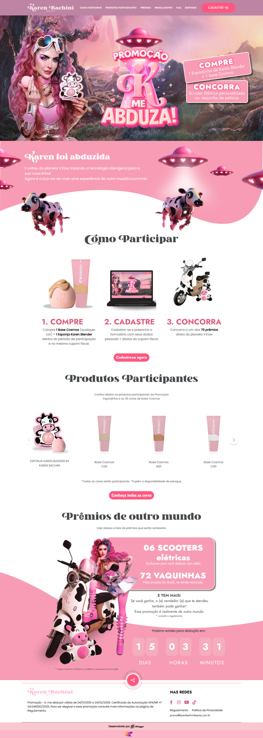 A promoção “K, Me Abduza” foi criada para impulsionar a nova linha Karen Bachini Beauty, usando a narrativa de que Karen foi abduzida e retornou do Planeta V.Kow trazendo tecnologias “de outro mundo” para seus produtos. A ação integrou storytelling cósmico, compra estimulada e distribuição de prêmios. A Idplugger desenvolveu toda a plataforma da promoção e o hotsite oficial.