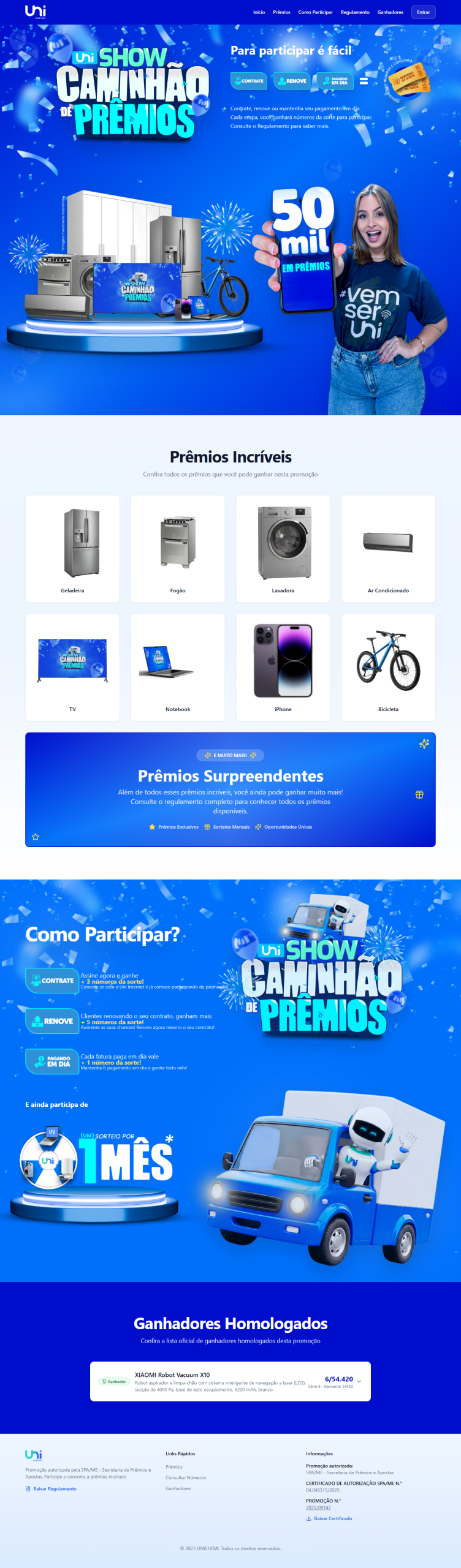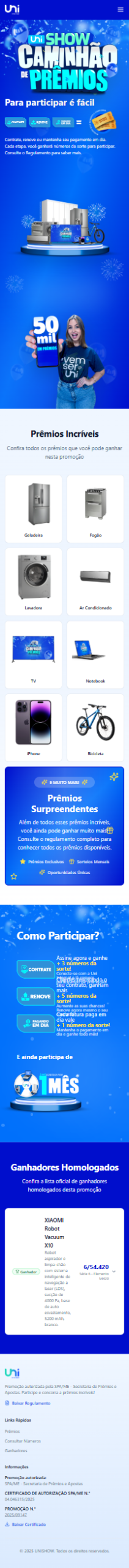 Na rota elétrica da Uni Internet, nasceu o Unishow Caminhão de Prêmios, uma promoção construída para transformar rotina em possibilidade. A idPlugger desenvolveu a plataforma que sustenta toda a experiência: simples, transparente e com aquela vibração de “pode ser hoje”. A cada adesão, renovação ou pagamento em dia, novos números da sorte entram no jogo — e, mês após mês, um caminhão simbólico de prêmios se movimenta.