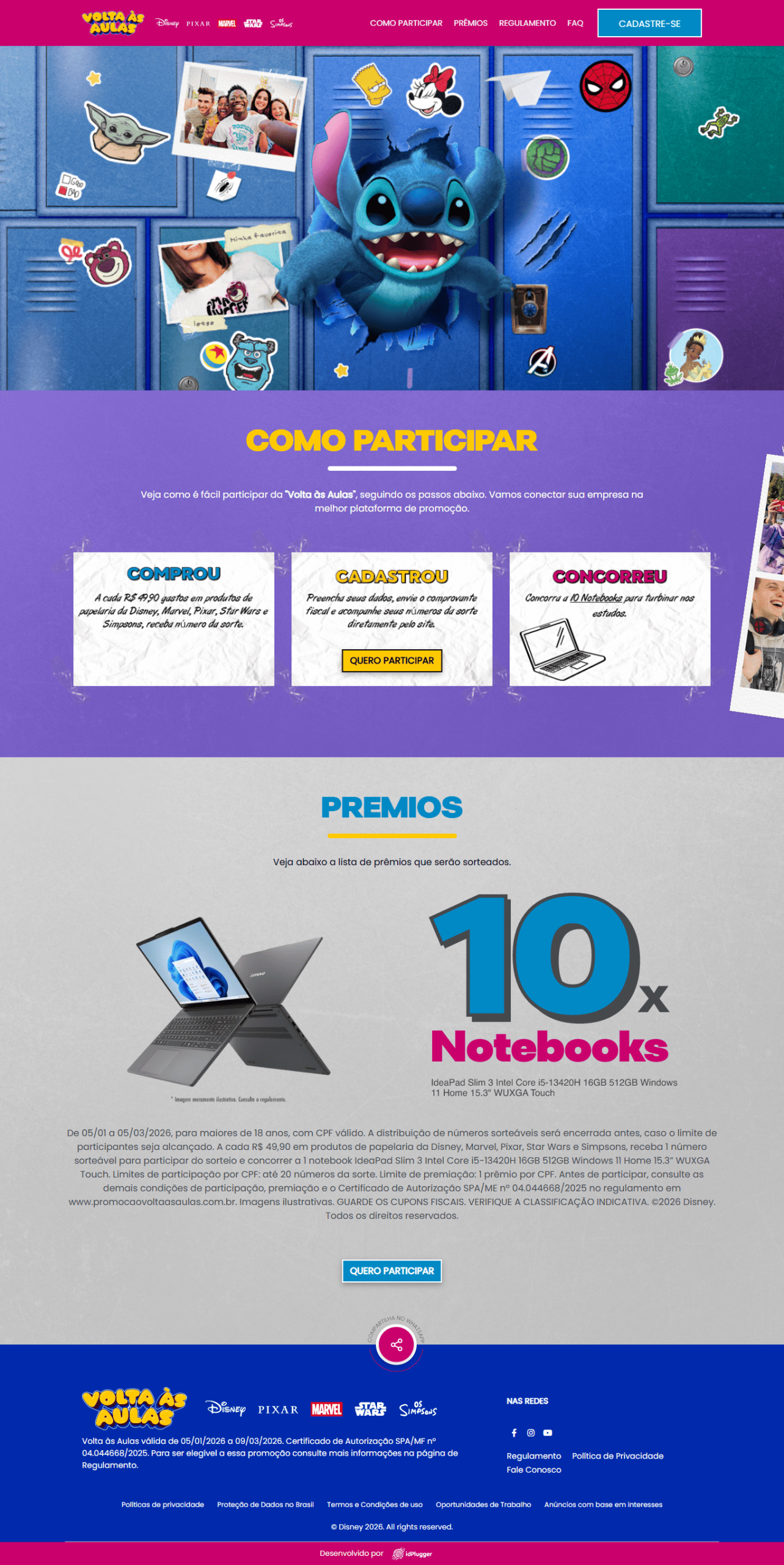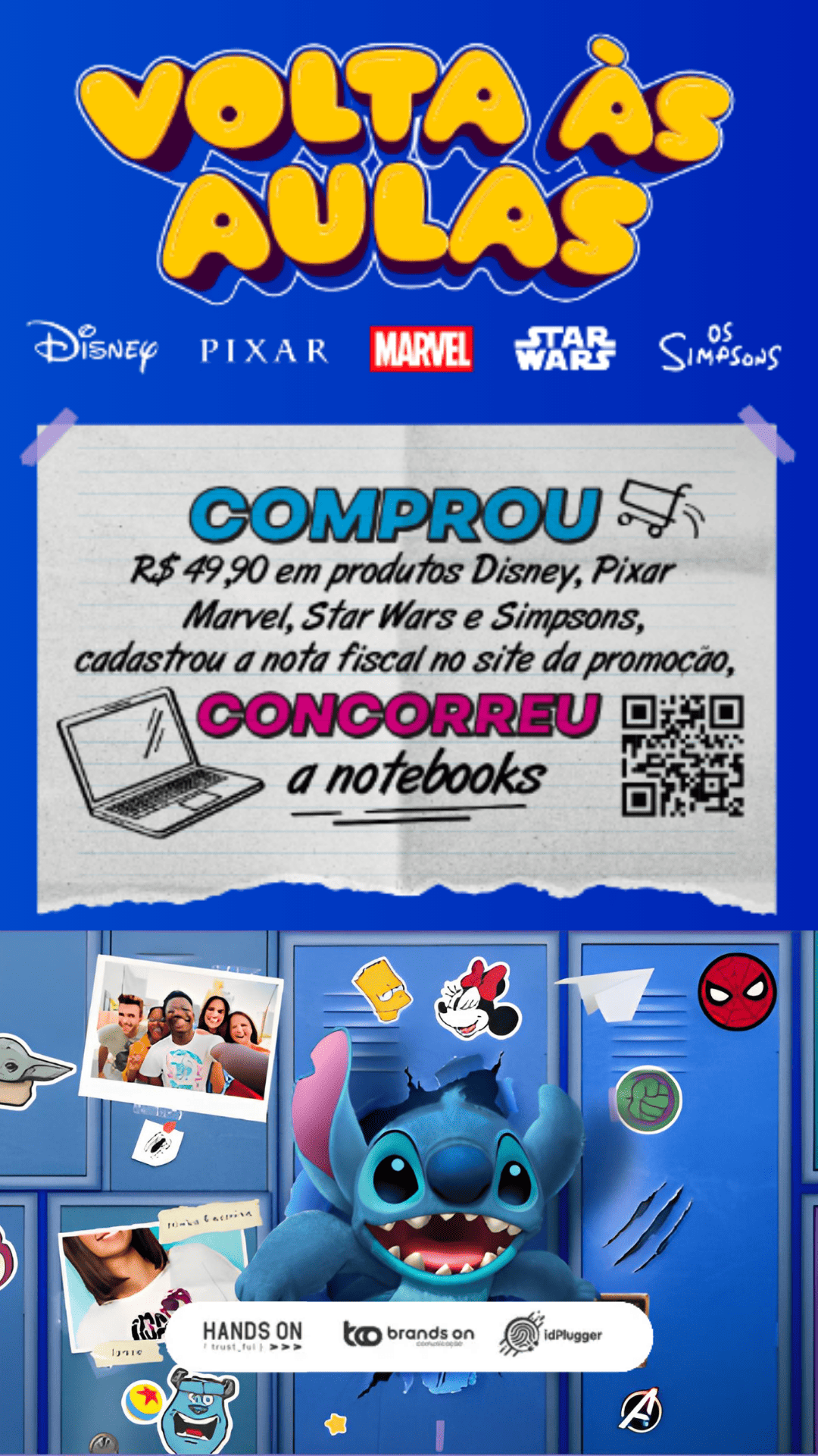 A promoção Volta às Aulas Disney foi criada para impulsionar as vendas de produtos de papelaria licenciados e estimular a participação do público por meio de uma mecânica de sorteio simples e escalável. A idPlugger foi responsável por toda a estrutura digital da campanha, incluindo o desenvolvimento do hotsite e da plataforma de cadastro e gestão dos participantes.